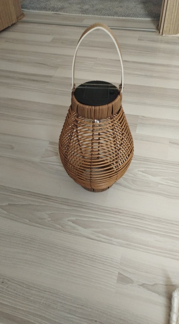 Bej hasır tasarıma sahip, hafif saplı taşınabilir lamba. yeni