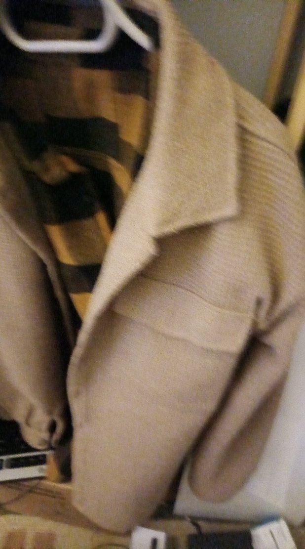 Bej renkte, yün kumaştan yapılmış, uzun kollu ve notched lapel yakalı hamile kaban. Rahat ve drapeli kesimiyle günlük sokak modasına uygun.