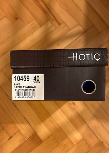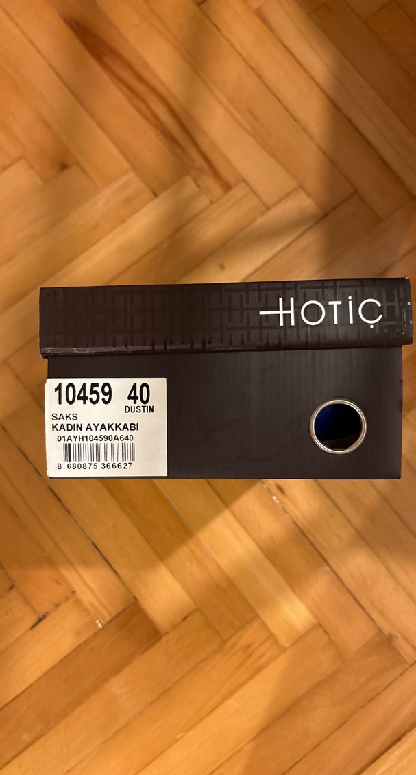 Saks renkte, Hotiç markalı kadın ayakkabı kutusu. Üzerinde ürün bilgileri ve marka logosu bulunur. Saklama veya paketleme için uygundur.