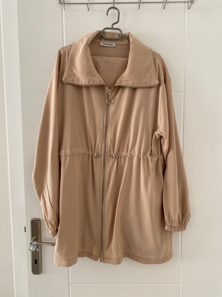 Yumuşak keten kumaştan yapılmış, uzun kollu, yakalı, fermuarlı ve ayarlanabilir bel detaylı bej renk ikili takım Rahat ve günlük kullanıma uygun.