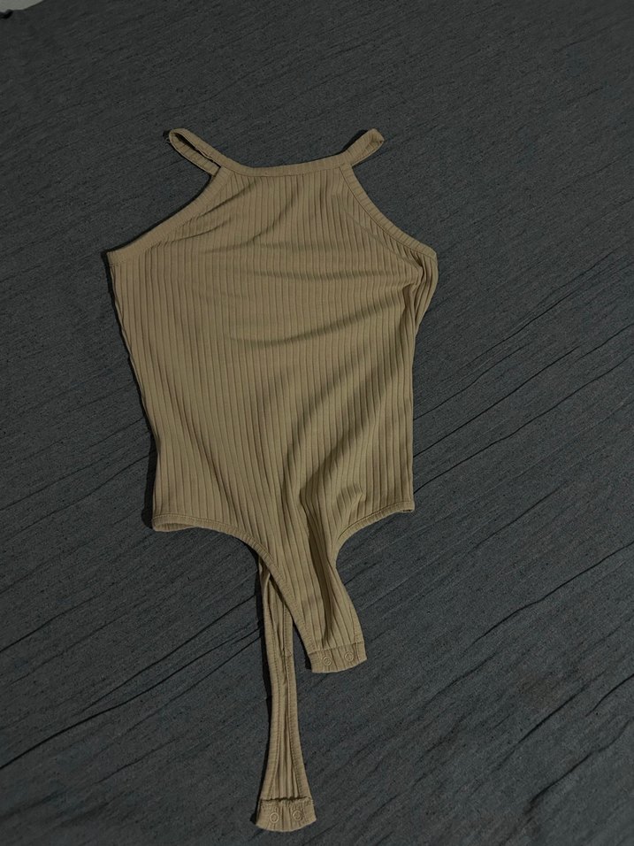 Bej renkte, ince askılı ve boğazlı kısa kesim fit body. Sentetik kumaştan, rahat ve şık bir günlük sokak stili sunar.