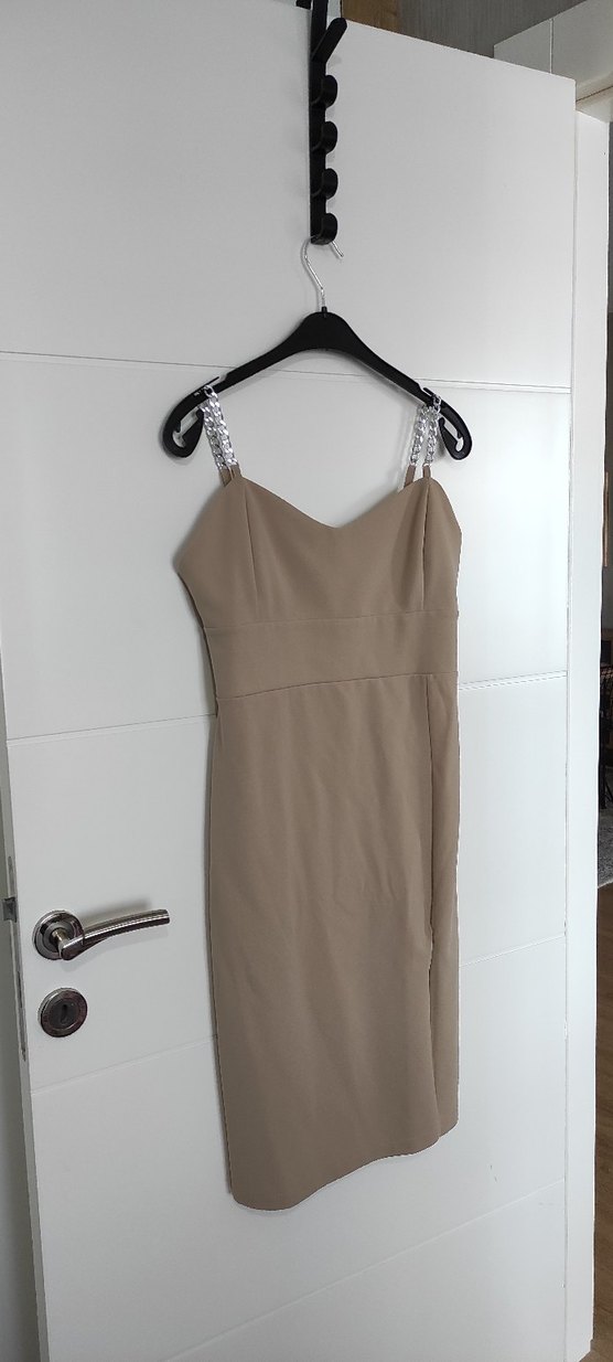 Bej renkli, ince askılı, V yaka ve drapeli detaylı, vücuda oturan uzun elbise. Minimalist ve çağdaş tarzda klasik şıklık sunar. Siyahı da sayfamda mevcut ☺️