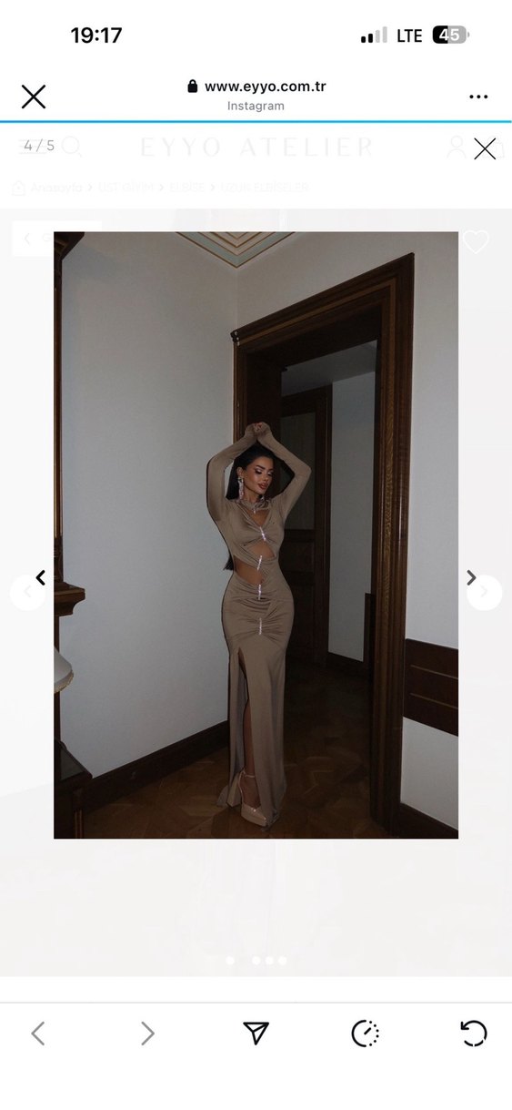 Bej renkli, ince askılı ve V yakalı uzun elbise, satenimsi kumaştan üretilmiştir. Yırtmaç detayı ile romantik akşamlar için uygundur. S besen
