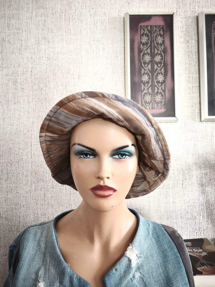 İnce kadife kumaştan bej ve gri sentetik kumaştan kadın şapka. Retro ve bohem tarzıyla dikkat çeker.