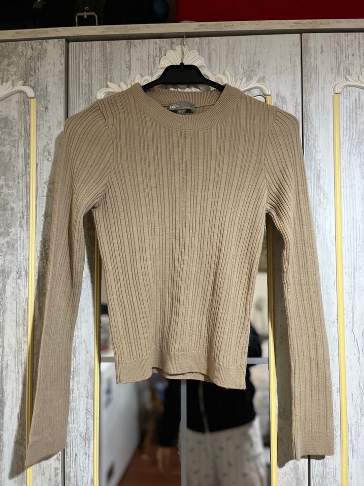 Bej renkli, ince örgü dokulu, uzun kollu ve bisiklet yaka kadın kazak. Rahat kesimi ve örgü deseniyle günlük kullanıma uygundur.
