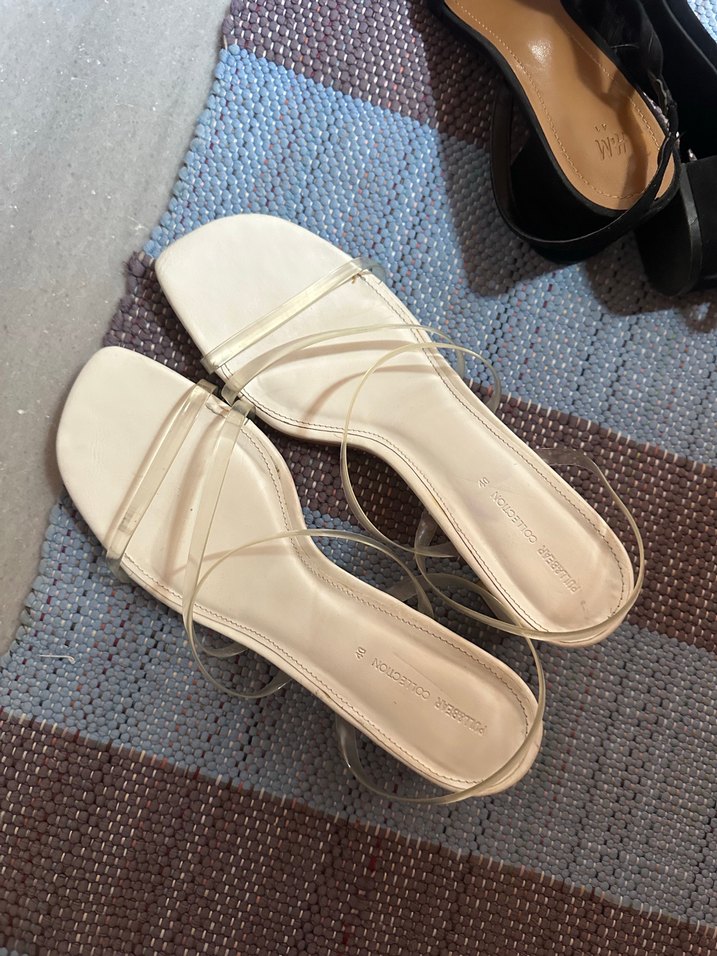 Bej renkte, ince topuklu ve şeffaf askılı minimal tasarımlı, kauçuk malzemeden günlük kullanım için rahat sandalet.