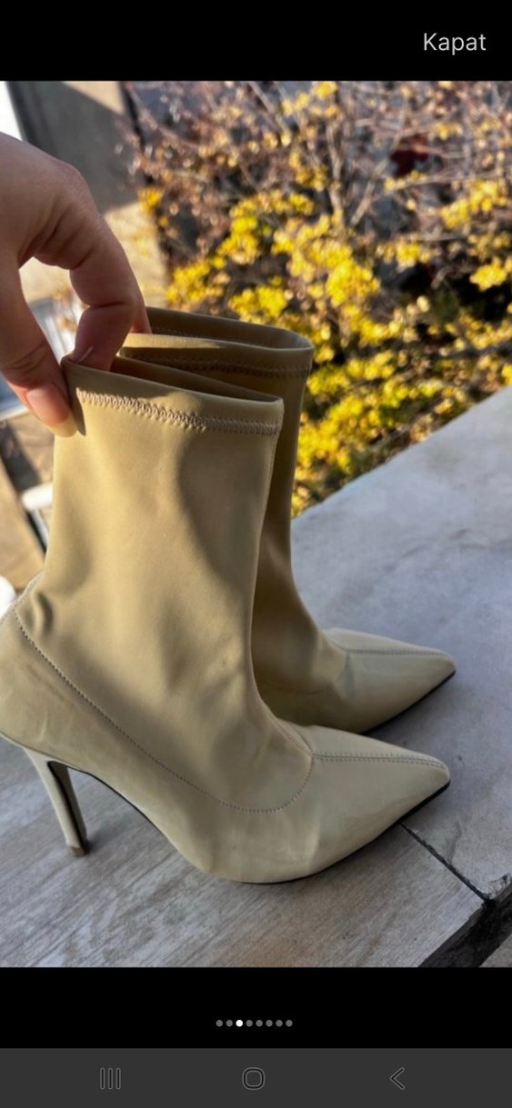 Bej renkte, ince topuklu ve sivri burunlu kadın botu. Elastik sentetik kumaştan, rahat uyum sağlar. Sokak modasına uygun şık tasarım.