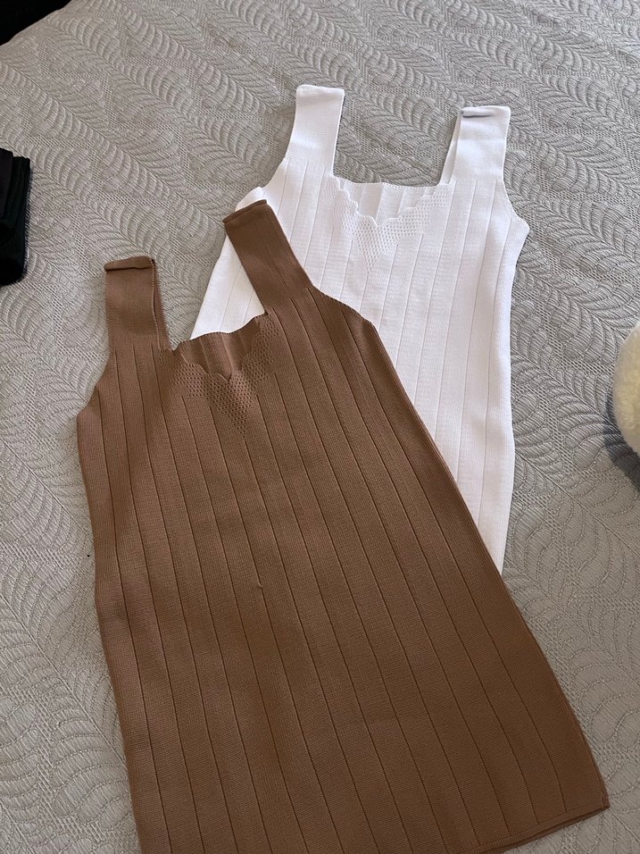 Bej renkli, ince triko kumaştan yapılmış, askılı ve midi boyda, vücuda oturan kadın atlet. Düz ve çağdaş tasarımıyla günlük kullanıma uygundur.