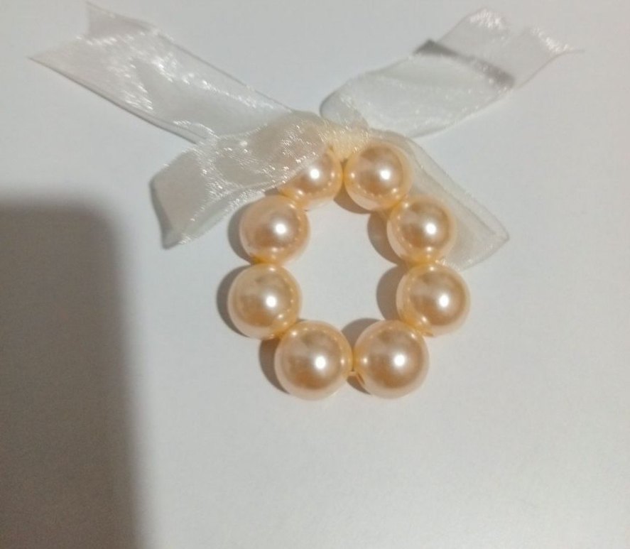 Büyük inci boncuklar ve şeffaf kurdele bağlamasıyla bej boncuklu peçete halkası 9 adet fiyatidir
