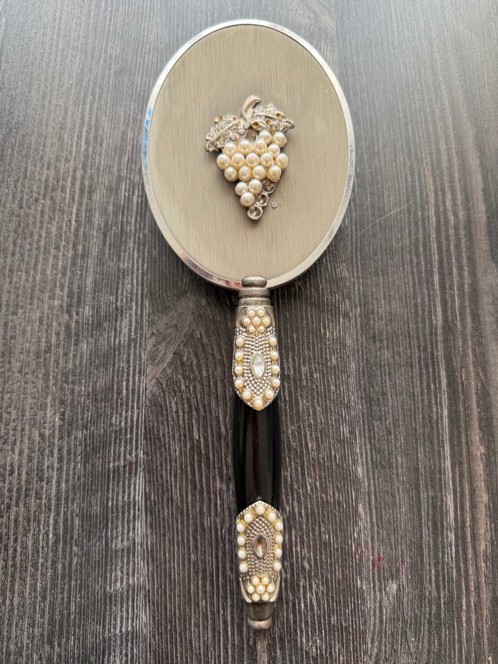 Parlak bej yüzeye sahip elde tutulan ayna, arka ve sap kısmında inci ve taşlarla süslenmiş üzüm motifi bulunur. Çok şık ve ağır bir üründür. İncilerinin birazı düşmüş