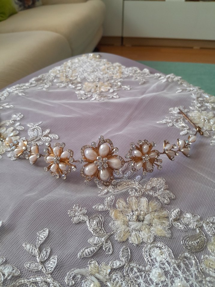 Bej renkte, boncuk işlemeli vintage tarzda, klasik şıklık için tasarlanmış saç aksesuarı. çok eski kusursuz 70 lerin gelin tacı.