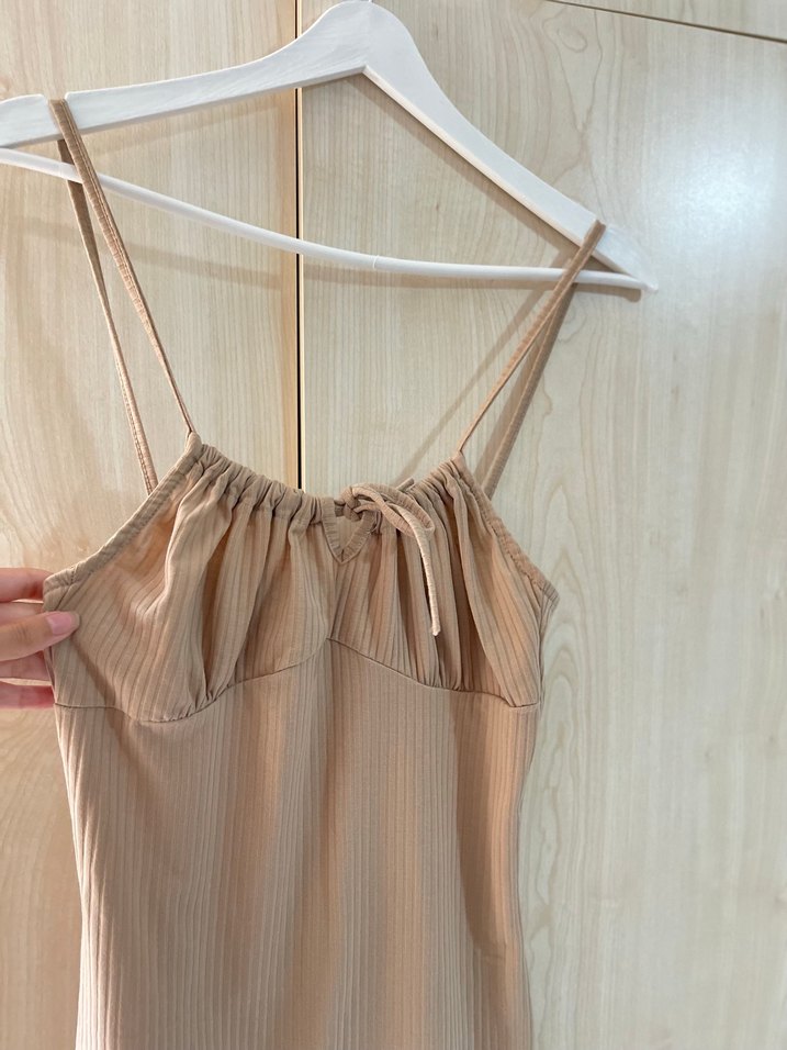 Bej renkli, ip askılı, pile detaylı ve dokulu keten kumaştan yapılmış, midi boy ve sade desenli, fit kesim örme elbise.