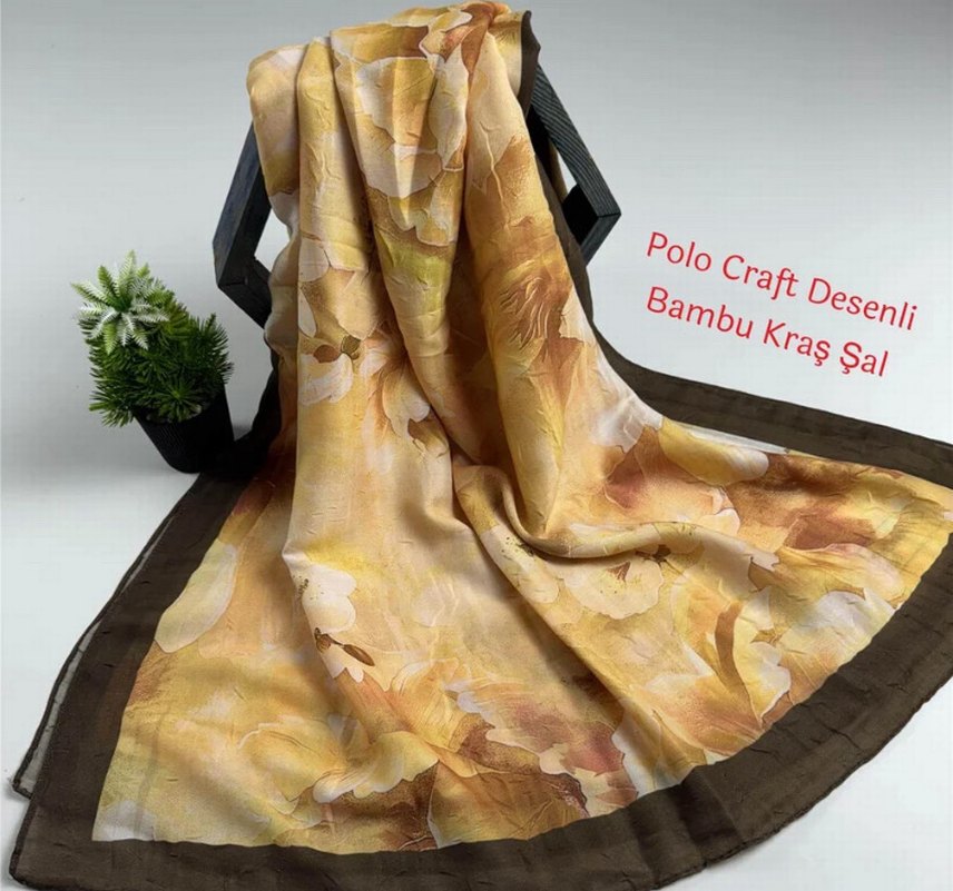 Bej renkli, ipeksi görünümlü ve parlak dokulu, bohem tarzda kadın şalı. Çiçek desenli, Polo Craf, Bambu K etiketli.