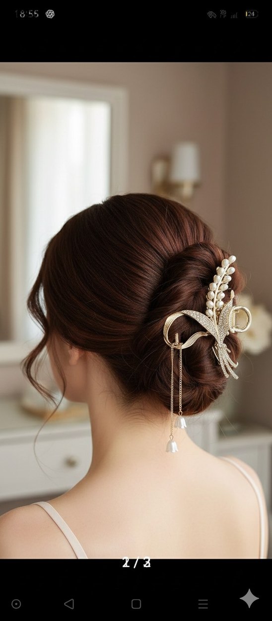 Bej, ipek görünümlü malzemeden yapılmış, inci ve zincir detaylı bohem tarzda fiyonk saç tokası, klasik zarafet katar.