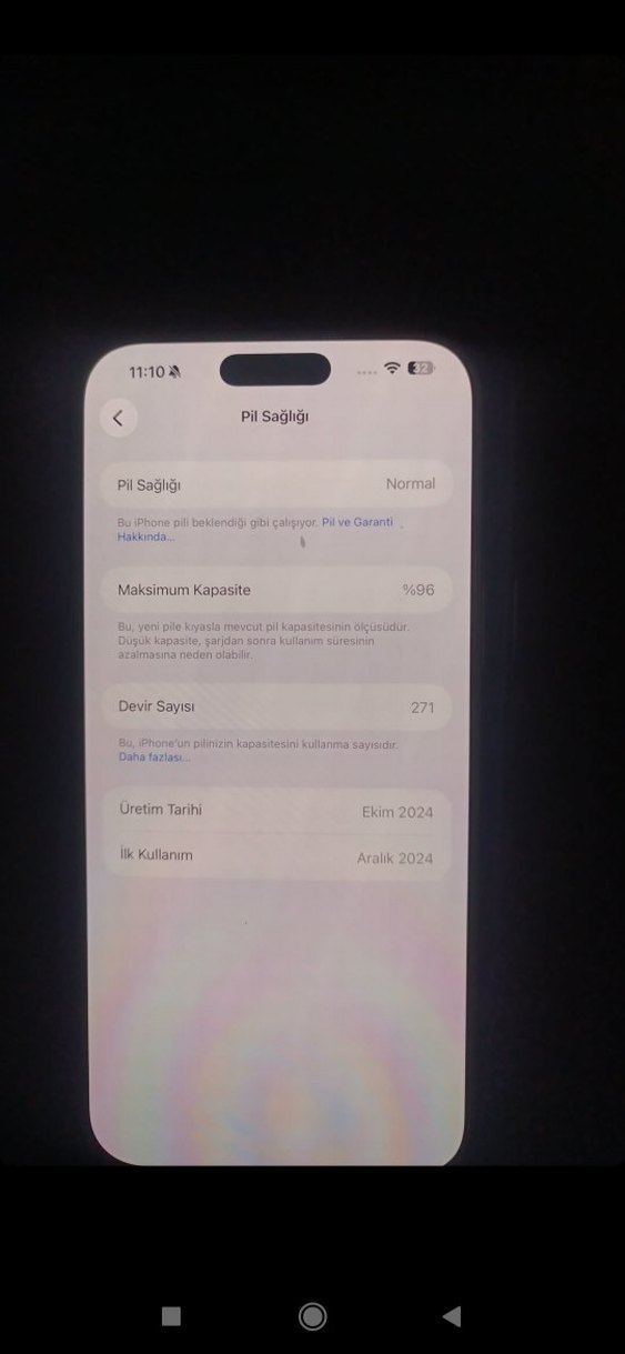 Bej iPhone, maksimum pil kapasitesi %96. Üretim tarihi Ekim 2024, ilk kullanım Aralık 2024. Pil sağlığı durumu normal.