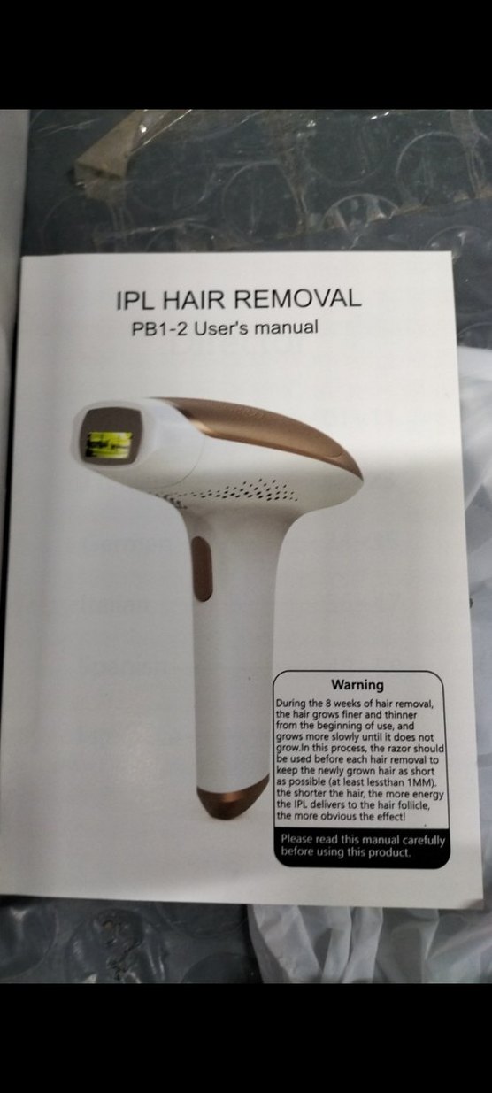 Bej renkli IPL lazer epilasyon cihazı, kullanım kılavuzu ve 8 haftalık epilasyon süreci uyarısı içerir. Etkili tüy azaltımı sağlar. ⚡