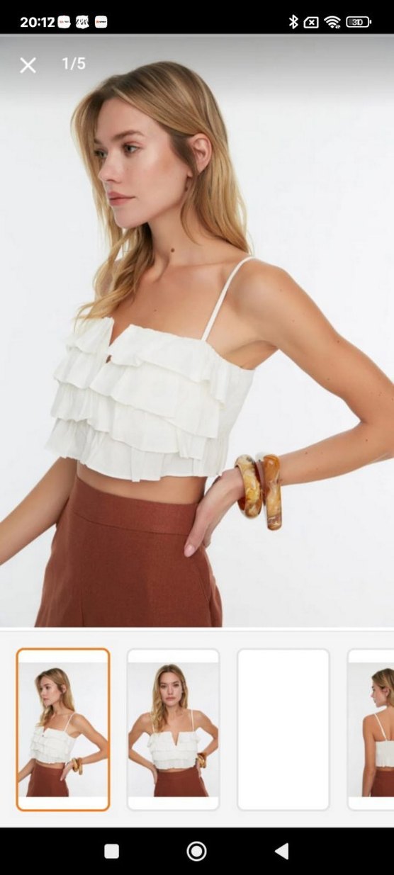İnce ipli askılı, katmanlı fırfırlı, bej pamuklu, bol kesim ve tekne yakalı mini büstiyer.