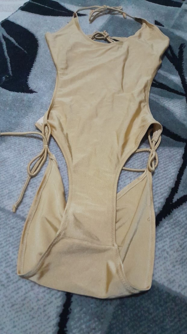 Bej renkte, ip detaylı, vücuda oturan midi uzunlukta kadın mayo. Günlük kullanım için rahat ve şık bir tasarım sunar.