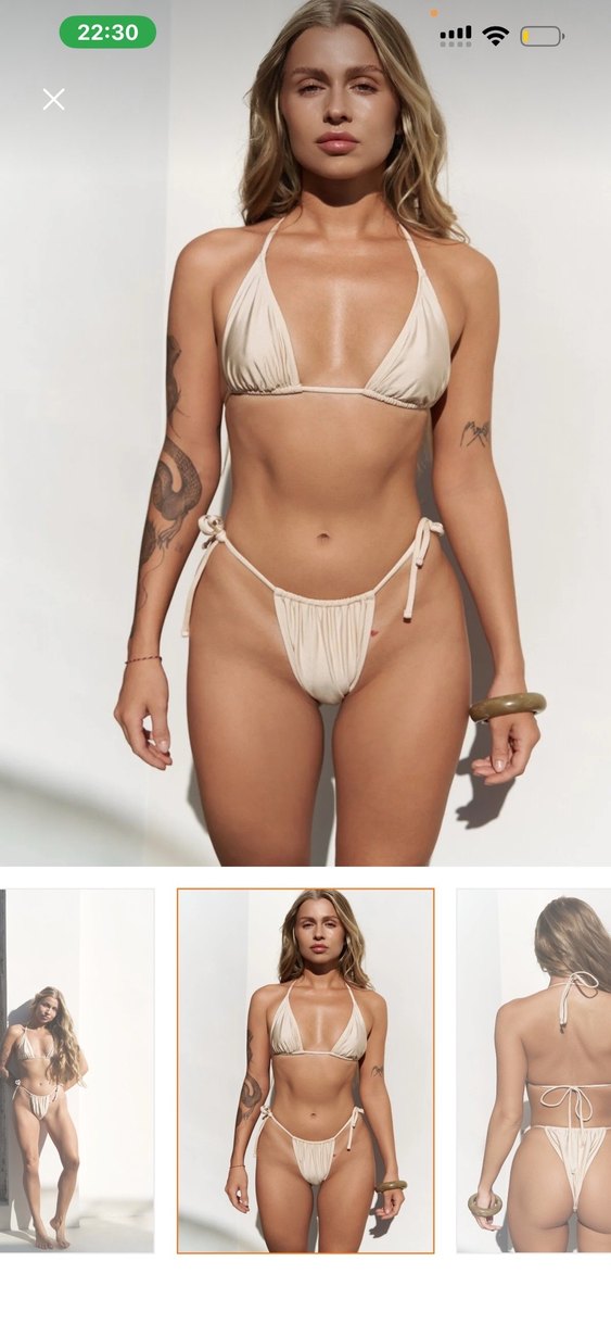 Bu bej bikini, ip detayları ve vücuda oturan kesimiyle minimal ve bohem tarzda, plaj için zahmetsiz şıklık sunar.