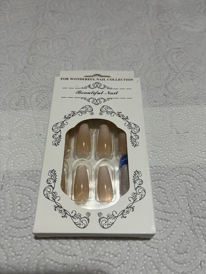Bej renkli, hafif ışıltılı takma tırnak seti. "Beautiful Nail" yazılı şık kutuda sunulmuştur. Kolay tırnak dekorasyonu için uygundur. 24 adet tırnak 24 adet yapıştırıcı bir adet törpü