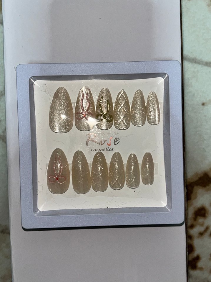 Işıltılı ve zarif desenlere sahip açık bej tırnak dekorasyon seti, fiyonk ve desen detaylarıyla şık bir görünüm sağlar.