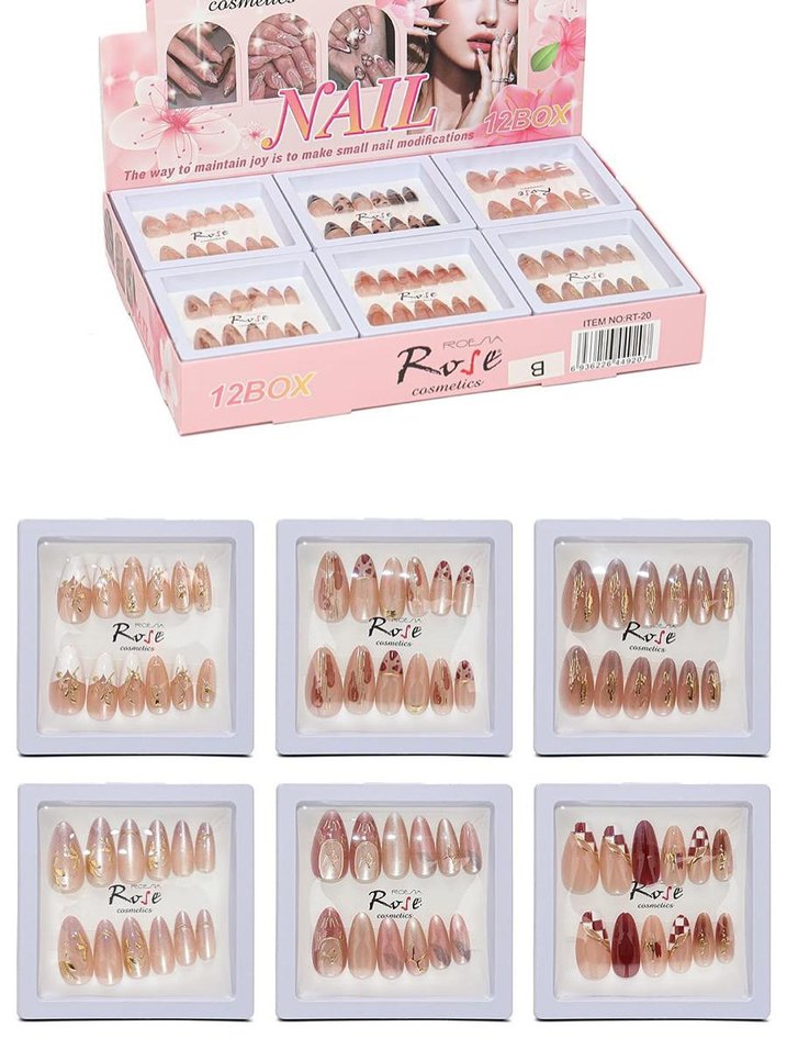 Rote Rase markalı, farklı desenlerde 12 parçadan oluşan açık bej tırnak süslemeleri seti.