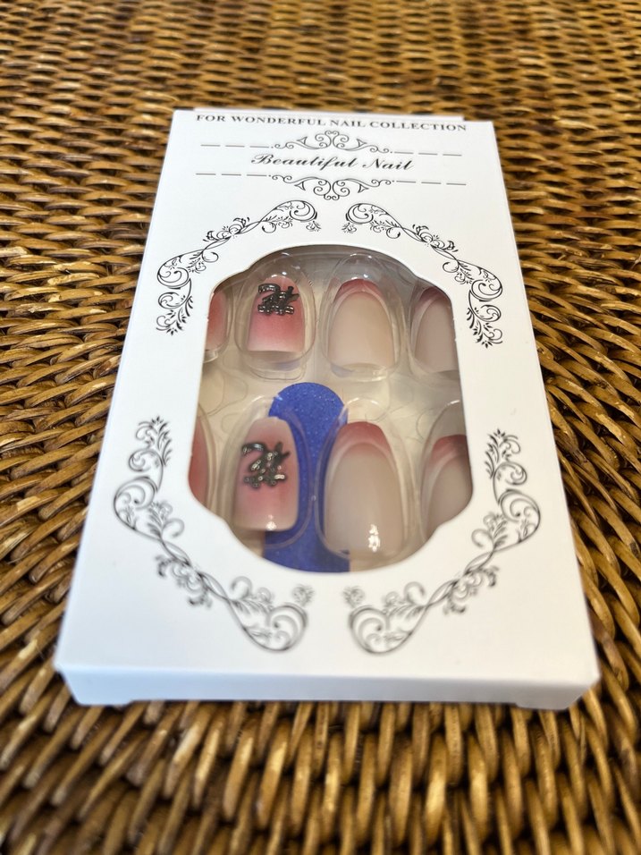 Bej ve açık pembe tonlarında, siyah süslemelerle detaylandırılmış yapay tırnak seti. 24 adet tırnak 24 adet yapıştırıcı bir adet törpü