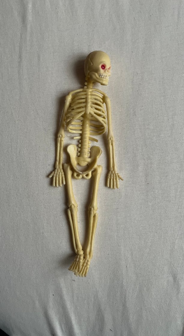 Kırmızı gözlü, açık bej renkte iskelet figürü. Detaylı kemik yapısına sahip, hareketli oyuncak. ☠️