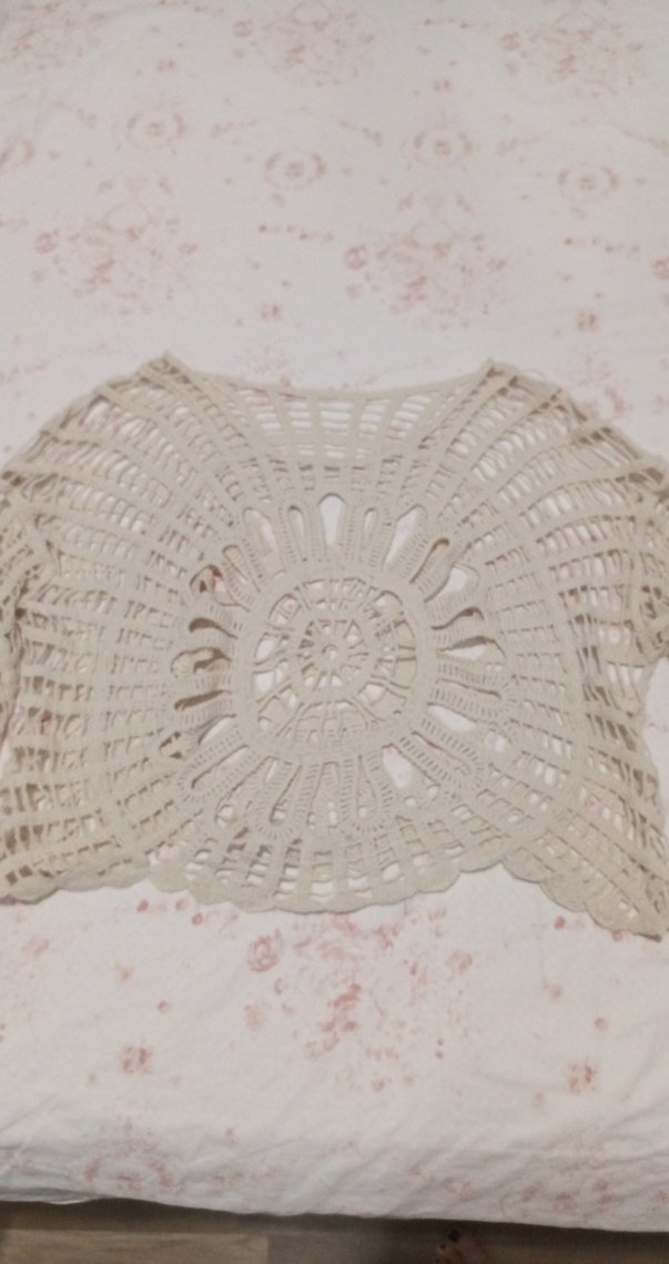 Bej işlemeli dantel detaylı örgü panço, kayık yaka ve bol kesim. Askılı kolları ve kısa mini boyu ile bohem tarzda.