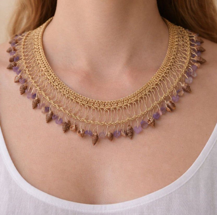 Bej renkte, işlemeli ve boncuk detaylı bohem kolye, küçük deniz kabuğu şeklinde süslemelerle hafif ve doğal bir görünüm sunar. Midi uzunluktadır ve günlük kullanıma uygundur.