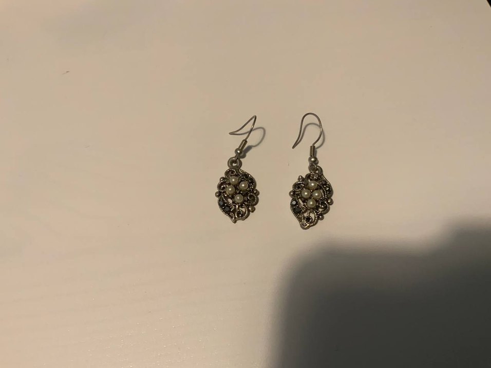 Bej renkli, işlemeli ve boncuk detaylı bohem tarzı küpe. Gri tonlar içerir ve günlük kullanıma uygundur.