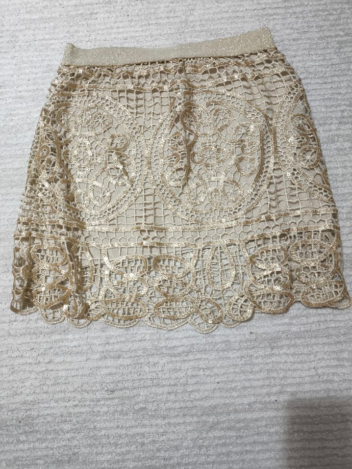 İşlemeli dantel örme kumaştan yapılmış, parlak bej renkli, bohem tarzda kısa ve dar kesim mini etek.