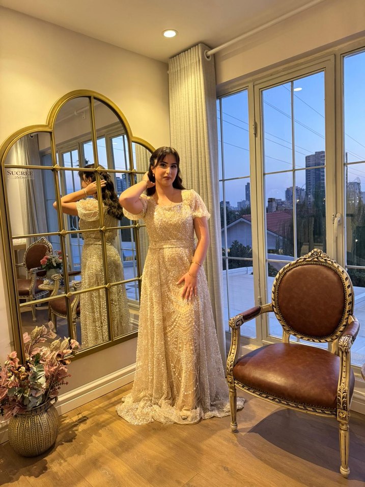 Bej renkli, işlemeli dantel detaylı uzun abiye elbise; tekne yaka ve kısa kollu, klasik ve şık bir kesime sahiptir