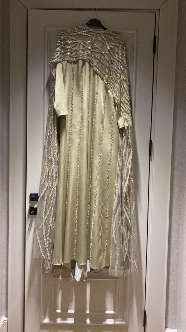 Bej renkli, uzun kollu ve yakalı, işlemeli drapeli uzun abiye elbise, düğünler için uygun.