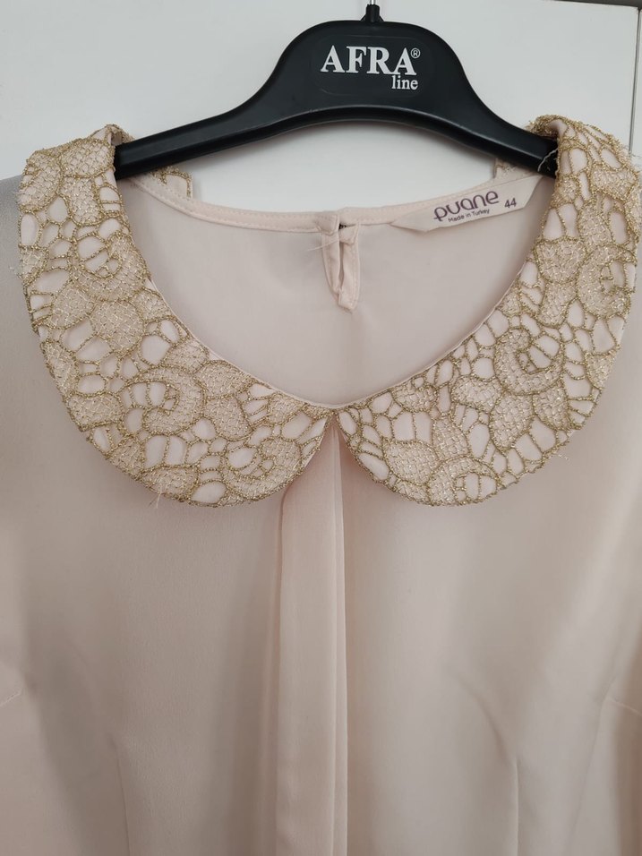 Bej renkli, zincir detaylı ve işlemeli yakaya sahip, uzun kollu, bol kesim ve uzun boylu, ipeksi dokulu kadın bluz. Ofis için uygundur ve modern klasik tarz sunar. ✨ Puane marka, 44 beden, yandan fermuarlı, belden oturtmalı, kol düğmeleri eksik olduğu için dikili. Onun dışında herhangi bir sorunu yoktur.