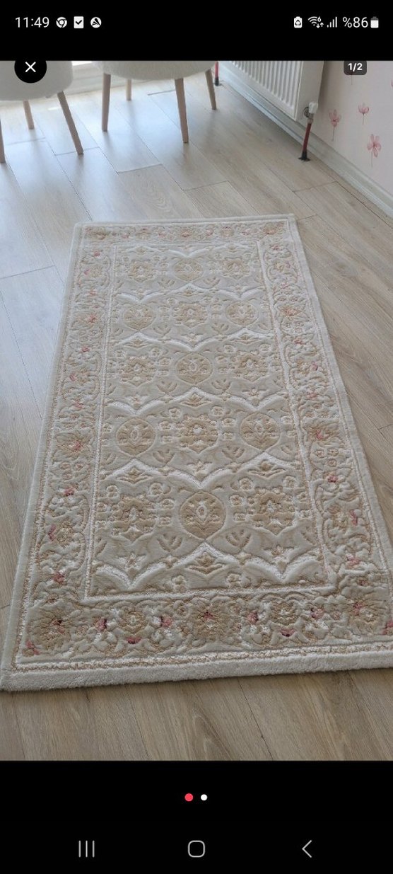 Bej renkli, işlemeli desenlere sahip klasik tarzda, yumuşak ve açık tonlarda bir halı. 80*150