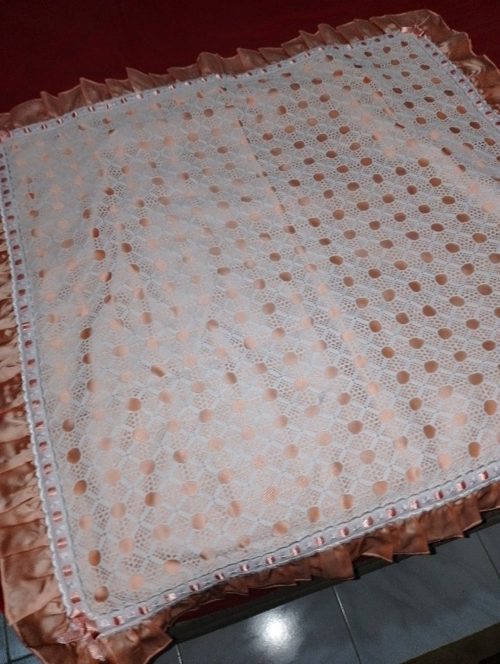 İşlemeli desenli ve parlak görünümlü bej masa örtüsü, fırfırlı kenar detayıyla klasik bir stile sahiptir. ️