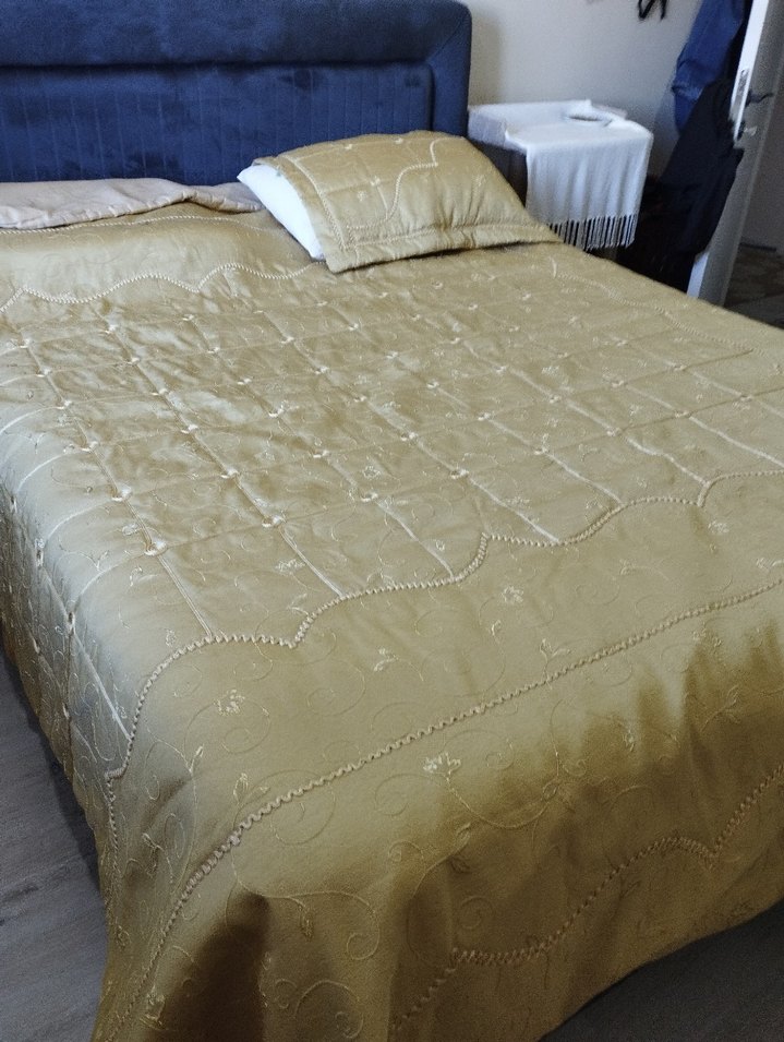Bej renkli, parlak kumaş ve işlemeli desenli yatak örtüsü. Uyumlu yastık kılıfı ile birlikte. özel dikim Battal boy yatak örtüsü çift kişilik, iki adet yastığı vardir
