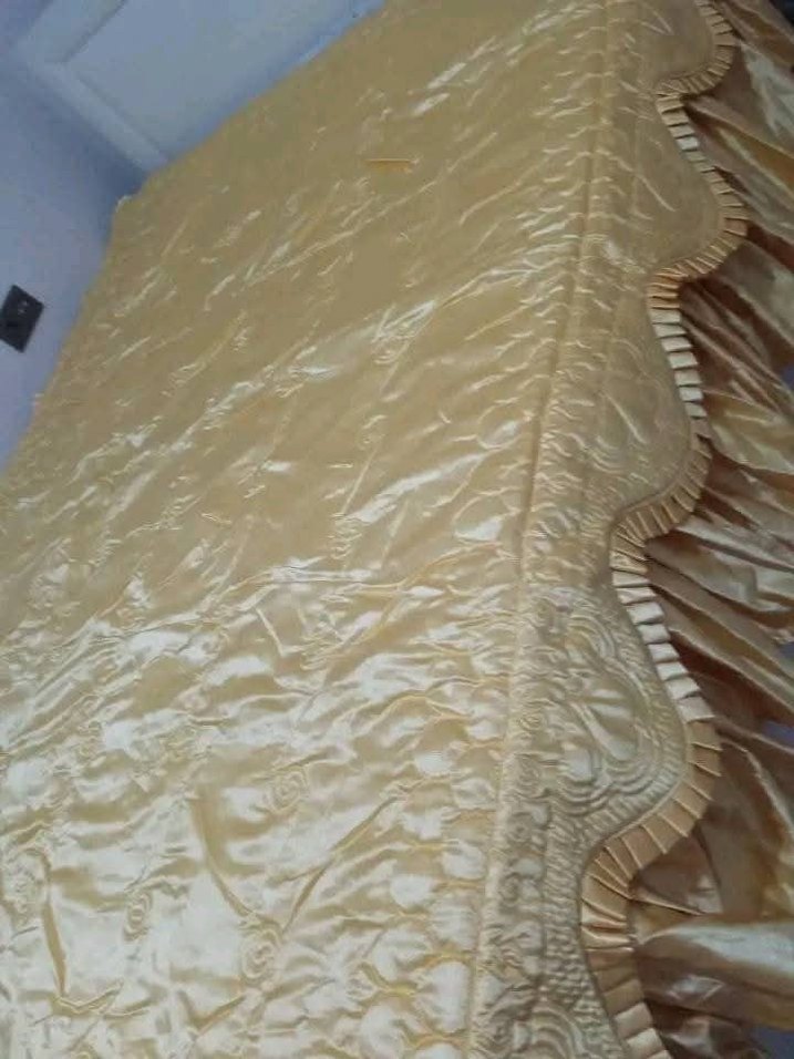 Parlak kumaştan yapılmış, işlemeli detaylara ve dalgalı kenarlara sahip bej yatak örtüsü. ️