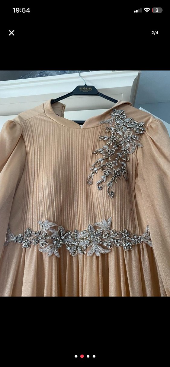 Bej renkli, uzun kollu, tekne yakalı piliseli ve işlemeli detaylara sahip bol kesim abiye elbisedir. Parlak kumaşıyla düğünler için uygundur.