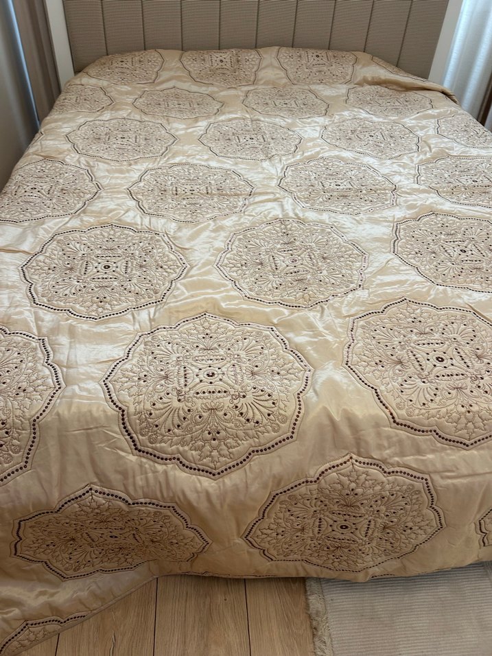 Bej renkli, parlak görünümlü ve işlemeli desenlere sahip yatak örtüsü, yatak odasına şıklık katıyor.Dolabımdan 300 TL altında begendiginiz bir çantayı hediye olarak ekleyecegim