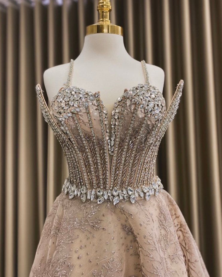 İnce işlemeli ve boncuk detaylı, straplez, uzun ve bej tonlarında klasik şıklıkta nişan elbisesi. Kollu olmayan, modern kesimle tasarlanmıştır. 34-38 beden uyumlu Kına-Nişan Elbisesi hiç kullanılmadı askıları çıkarılabilir
