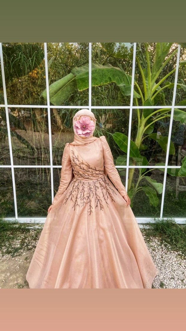 Bej renkli, işlemeli ve uzun kollu, tesettürlü, düğün için uygun şık ve klasik kesim abiye elbise. Sadece bir kez nişanda tarlatan ile kullanıldı