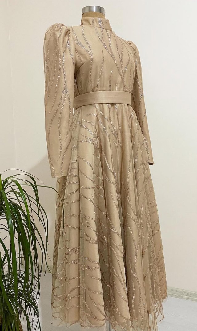 Bej renkli, işlemeli ve parlak desenlere sahip uzun abiye elbise.
