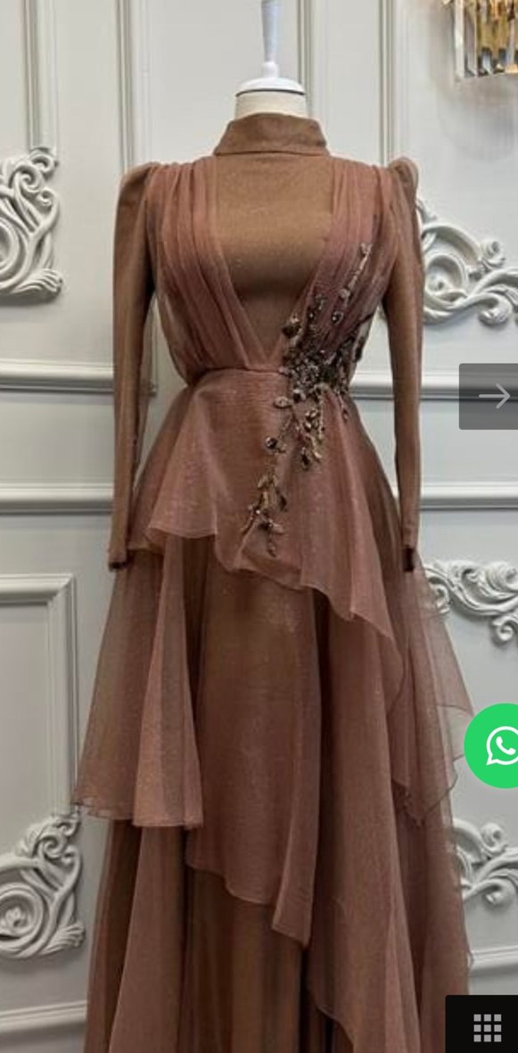 Bej İşlemeli Uzun Abiye Elbise