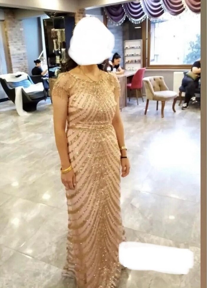 Pudra renkli, uzun ve vücuda oturan bu nişan elbisesi, kayık yaka ve ince askılarla tasarlanmıştır. Parlak boncuk işlemeleriyle klasik ve göz alıcı bir görünüm sunar. Sadece 1 saat giyildi temiz pudra rengi