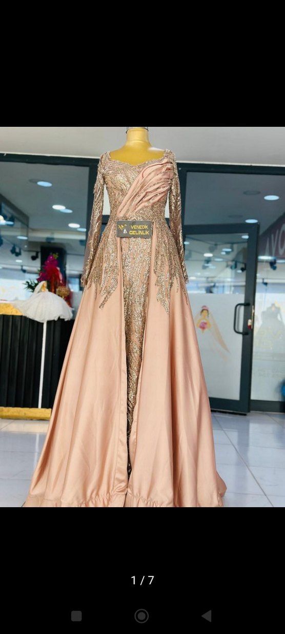 Bej renkli, V yakalı ve uzun kollu bu uzun abiye elbise, parlak işlemeler ve drapeli detaylarla modern klasik bir görünüm sunar. Düğünler için uygundur. ✨