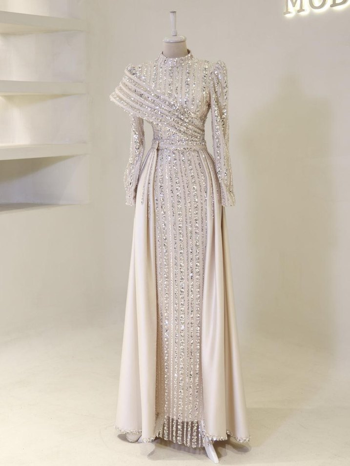 Bej İşlemeli Uzun Kollu Abiye Elbise
