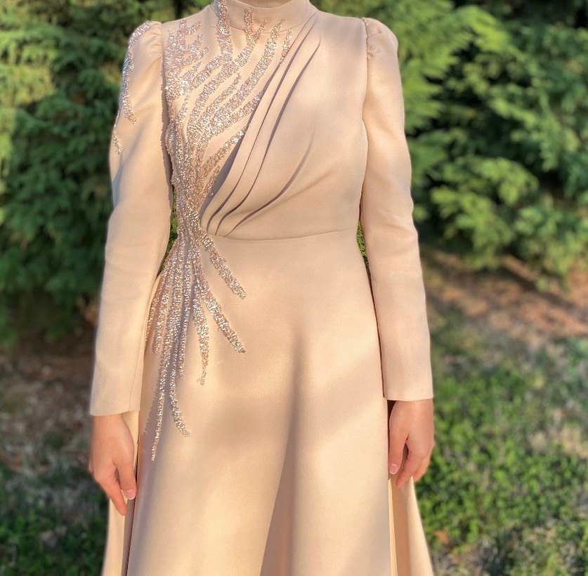 Bej renkte, yüksek yakalı ve uzun kollu işlemeli detaylara sahip, drapeli uzun abiye elbise. Klasik ve şık kesimiyle düğünlere uygundur.✨ Nişanım 1 kere giydim sadece Mehtap Koçak marka özel dikimdir 65 kiloya kadar rahat olur