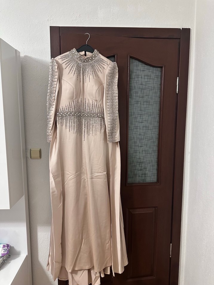 Bej İşlemeli Uzun Kollu Abiye Elbise